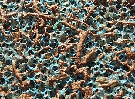 Wat mij opvalt is dat het ganse filter bezaaid is met bruin slib, het ziet eruit als kleine worstjes. Ze zitten/hangen op en tussen de matten, als je er over wrijft, dan vervallen ze in bruin stof (slib).