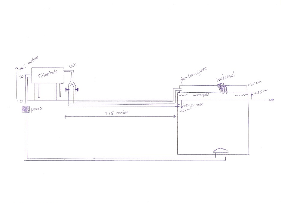 Het volgende probleem is de retour leiding voor het plantenfilter. Dit filter staat boven op het straatwerk. De leiding komt dus van onder het straat werk naar boven (zo'n 25 cm) en moet dan in de plantenvijver via een wanddoorvoer. Omdat het water weer omhoog moet geeft dit dan niet teveel tegendruk dat hierdoor het filter overloopt?