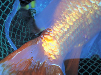 Een van onze vissen, een sluier-goudvis heeft net voor zijn staart een aantal bulten die een wit topje hebben. Op die plekken staan de schubben ook wat uit elkaar, en ook zijn er een wondjes te zien onder de bulten. Ik heb m er toen uitgeschept, en uit een van die bulten trok ik toen met een pincet iets wat lijkt op visdraad (doorzichtig) met een soort zakje aan het einde.
