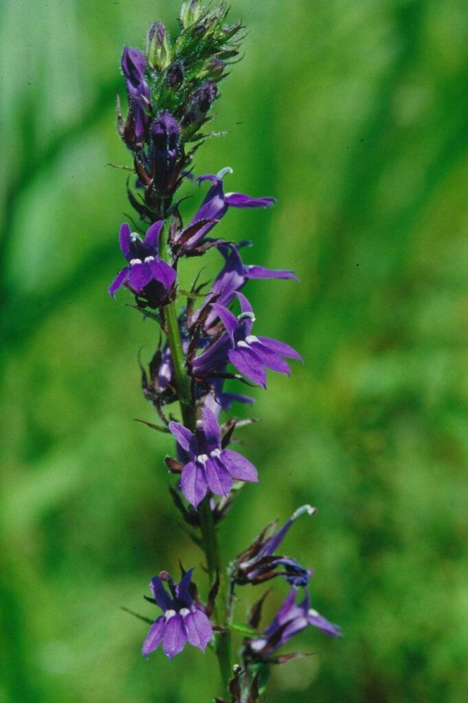 Virginische lobelia is in onze streken goed winterhard en bloeit van juli tot oktober. Het is een langbloeier die meestal tussen 70 cm en 90 cm hoog wordt. De Virginische lobelia verkiest vruchtbare, vochtige grond en mag gerust in de schaduw staan. De dikke bebladerde aren zijn rondom bezet met blauwviulette bloemen. Virginische lobelia zaait zich vaak zelf uit maar meestal zonder lastig te worden. Er worden soms kulonies gevormd die goed harmoniëren met een wilde of halfwilde beplanting. Virginische lobelia kan gewoon in de tuinborder maar voelt zich veel beter in het moeras, met de wortels in het nat. De kroon steekt wel best boven het water uit, hoewel een tijdelijke onderdompeling redelijk goed verdragen wordt. Er bestaat een witte vorm, Lobelia siphilitica “Alba”, die ook vrij courant te vinden is in de speciaalzaak. Deze witte vorm kan gebruikt worden om donkere hoekjes rond de vijver op te vrolijken.